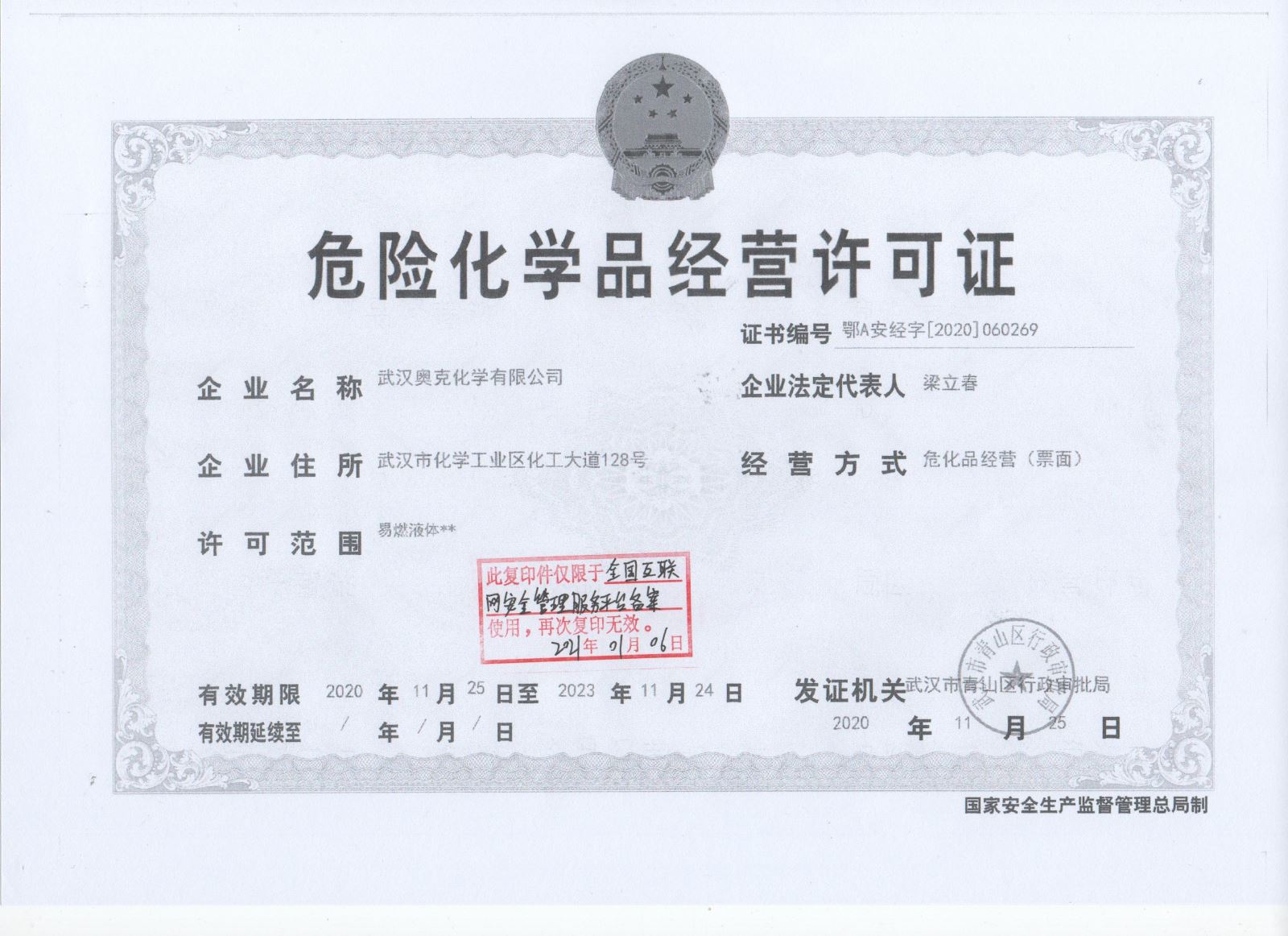 武漢奧克危險化學(xué)品經(jīng)營許可證